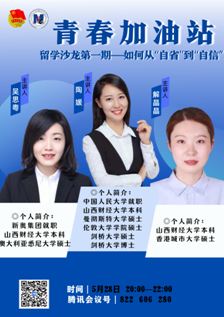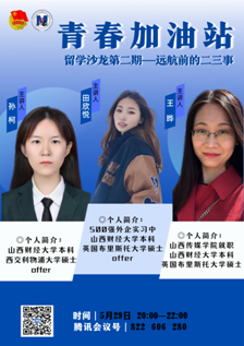 为进一步提升学院国际化水平和毕业生深造率,亚洲无码 依托学院团委“青春加油站”品牌活动,于5月28日、29日通过线上形式举办了留学沙龙。本次沙龙邀请了在悉尼大学获得硕士学位的吴思粤、在剑桥大学获得博士学位的陶媛、在香港城市大学获得硕士学位解晶晶、在布里斯托大学获得硕士学位的田欣悦和王晔、就读于西交利物浦大学硕士研究生孙柯6位校友进行留学经分享。学院青年教师和部分同学参加。