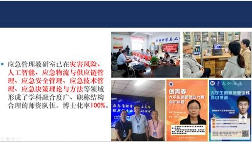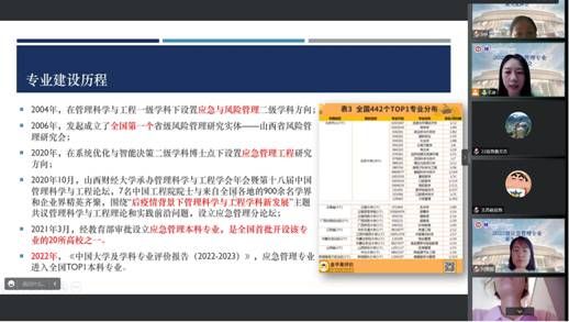 应急管理专业建设历程重要节点进行介绍。2021年3月,经教育部审批,山西财经大学设立应急管理本科专业,成为全国首批开设该专业的20所高校之一;2022年,根据《中国大学及学科专业评价报告(2022-2023)》,山西财经大学应急管理专业进入全国TOP1本科专业。专业紧密围绕习近平总书记提出的国家安全观的顶层要求,通过合理的课程体系设计,旨在培养拥有高度社会责任感、具备国际视野、创新精神、德智体美劳全面综合发展的高素质应急管理人才。会议第二阶段,由应急管理教研室副主任闫慧丽老师介绍教研室师资力量,应急管理教研室师资力量雄厚,现有教授3人,副教授4人,讲师3人,博士化率100%,已在灾害风险、人工智能、应急物流与供应链管理、应急安全管理、应急技术管理、应急决策理论与方法等领域形成了学科融合度广、职称结构合理的师资队伍,能够有力支撑“本-硕-博”完整的应急管理人才培养体系。同时,在人才培养过程中,专业突出理论教学、实践训练和应急管理规划与设计相融合,在开展应急管理理论教学与科学研究的同时,为学生提供创新创业、学科竞赛指导,以及应急管理大讲堂特色活动,搭建“学科竞赛+科研项目+应急演练”三位一体的个性化育人平台。