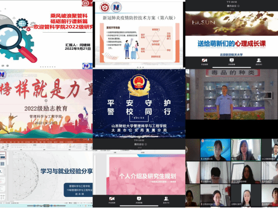打磨通识教育总体方案。学院党委书记通过开学“第一课”《积极开展党建双创,传承立德树人使命》,结合学院全国党建工作标杆院系培育创建理念,引导学生坚定理想信念,练就过硬本领,投身报国伟业。学院院长结合学校、学院校史院情,号召研究生新生爱校荣校、树立远大理想,努力实现从“学校为我做了什么”到“我能为学校做什么”的转变;学院团委书记结合研究生学籍管理及生涯规划,学习了研究生管理手册,引导新生从现在开始规划好自己的研究生活,不负韶华。北京航空航天大学心理咨询中心冯蓉副教授为新生进行心理健康教育,鼓励学生塑造阳光心态 成就更好自己。太原市强制隔离戒毒所管理科长刘利民警官和太原市公安局直属分局指挥室副主任王安瑞警官结合详实的工作案例,分别从禁毒知识和预防电信诈骗为大家上了一堂安全教育课,呼吁大家谨防诈骗、远离毒品,共同为营造和谐平安的校园环境贡献力量。山西省五四青年奖章获得者刘辉结合自己多年的志愿服务经历,号召大家都参与到奉献友爱的志愿服务中。就职于中国烟草的郭彦凯、国家税务总局的任文瑾、阳城县西河乡党办的初雯昕、之江实验室的赵泳琪和在华北电力读博的杨坤,5位杰出校友分别结合自身经历从读博、人才引进、考公、民企等为大家传授经验。9月24日下午的,班级主题班会“青春与科研相伴、成长与挚友同行”,辅导员与大家一同学习了《高校新冠肺炎疫情防控技术方案(第六版)》具体内容。97名同学精心准备了自我介绍与研究生规划,增进了班级凝聚力。