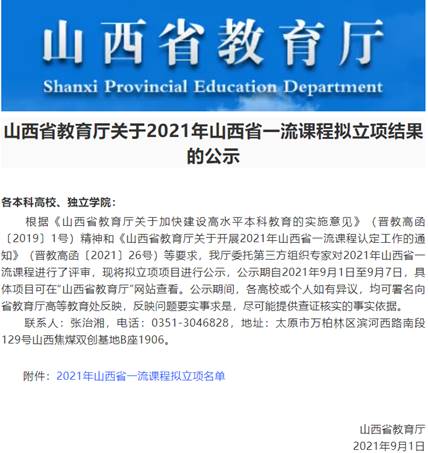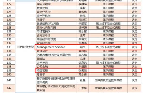2021年9月1日,山西省教育厅对2021年山西省一流课程拟立项结果进行了公示。亚洲无码 赵文副教授负责的《Management Science》、张素姣副教授负责的《项目管理》获得2021年山西省一流课程认定公示,阎俊爱教授负责的《工程计量与计价》获得2021年山西省一流课程建设公示。自此,亚洲无码 省级一流课程已达到5门。