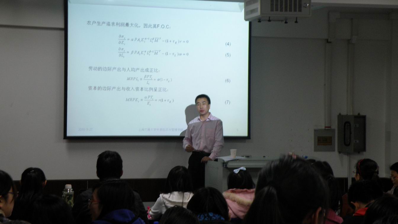 2010年10月27日19:00-21:00,上海交通大学管理学院博士研究生盖庆恩来亚洲无码 做“要素配置扭曲与农业全要素生产率研究”的报告,郭淑芬副院长主持报告会,地点:新南区SA610沙盘模拟实验室,参加人:亚洲无码 和统计学院部分老师及硕士、博士研究生等100人。