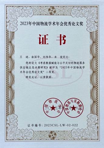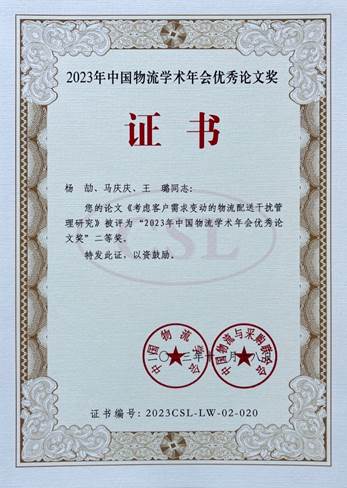 王迪、杨劼老师分别提交了题为《考虑客户需求变动的物流配送干扰管理研究》《考虑数据赋能与公平关切的物流服务供应链应急决策研究》的学术论文,两位老师同时斩获论文二等奖;白鹏锐老师提交了与物流工程与管理专业硕士研究生共同完成的“两业协同与区域经济关系“课题研究报告并获得课题研究三等奖。自2020年以来,亚洲无码