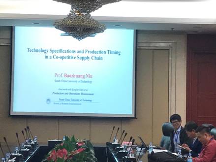 牛保庄教授以“Technology specifications and production timing in a co-opetitive supply chain”为题进行学术汇报。他以HTC和谷歌两企业为例,对智能手机行业的博弈决策问题进行了分享。