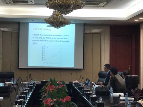 戴悦教授以“Managing multi-rooming: Why uniform price can be uinformly lower”为题进行学术汇报。她认为产品的电子属性和非电子属性是有一定相关性的,从这一假设出发对产品线上价格和线下价格对公司利润的影响进行分析汇报。