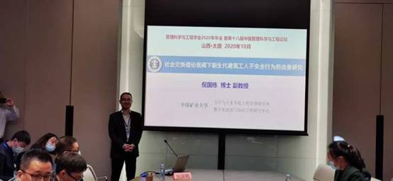 中国矿业大学倪国栋教授做了题为“社会交换理论视阈下新生代建筑工人不安全行为的改善研究”的报告。报告从研究背景、新生代建筑工人群体特征与不安全行为改善思路、新生代建筑工人不安全行为改善机理模型构建、新生代建筑工人不安全行为改善机理模型检验和研究结论与建议五个方面展开论述,倪国栋教授认为建筑工人的不安全行为是造成安全事故的重要原因。因此,分析研究建筑工人不安全行为的产生原因和并不断加以改善,有助于预防和控制安全事故的发生。