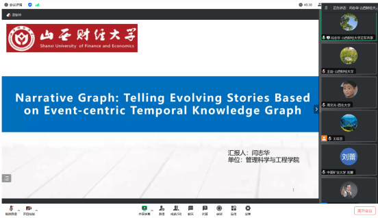 应急管理教研室教师闫志华作了题为《Narrative Graph: Telling Evolving Stories Based on Event-centric Temporal Knowledge Graph》的报告,围绕突发事件的层次演化结构的识别和应用进行汇报交流,具体包括研究概况、事件定义、知识图谱构建、模型比较、案例分析及研究总结六个部分,闫老师介绍了事件知识图谱在突发事件分析与预测中的前沿应用,以及基于事件知识图谱的故事线生成方法。